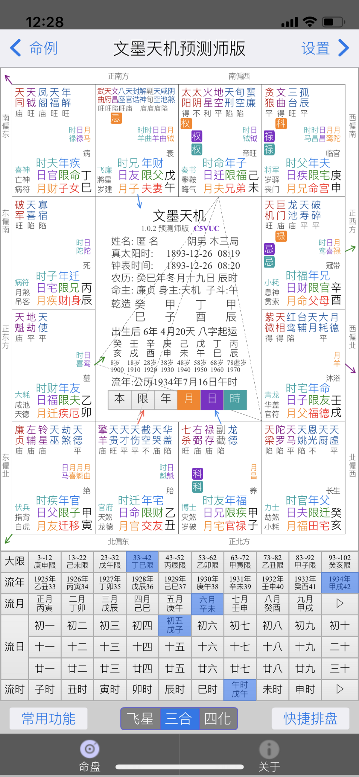 3. 提供精心设计的排盘界面,风格简约而不简单,兼容命理师和紫微斗数爱好者的既有使用习惯,盘面布局和配色风格与使用广泛的飞星、三合、四化排盘软件保持一致,大幅降低使用门槛。